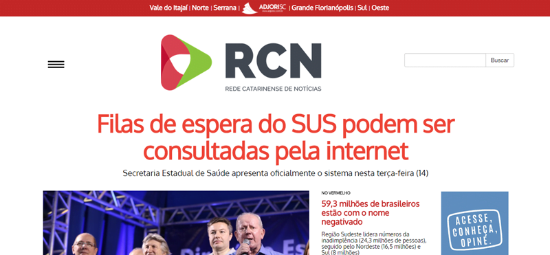 O destaque do site vai para a procura por regiões. Cada região de Santa Catarina possui uma área de destaques e uma lista de matérias no Menu.
